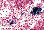 La coloration de Perls met en évidence les pigments d'hémosidérine. |
